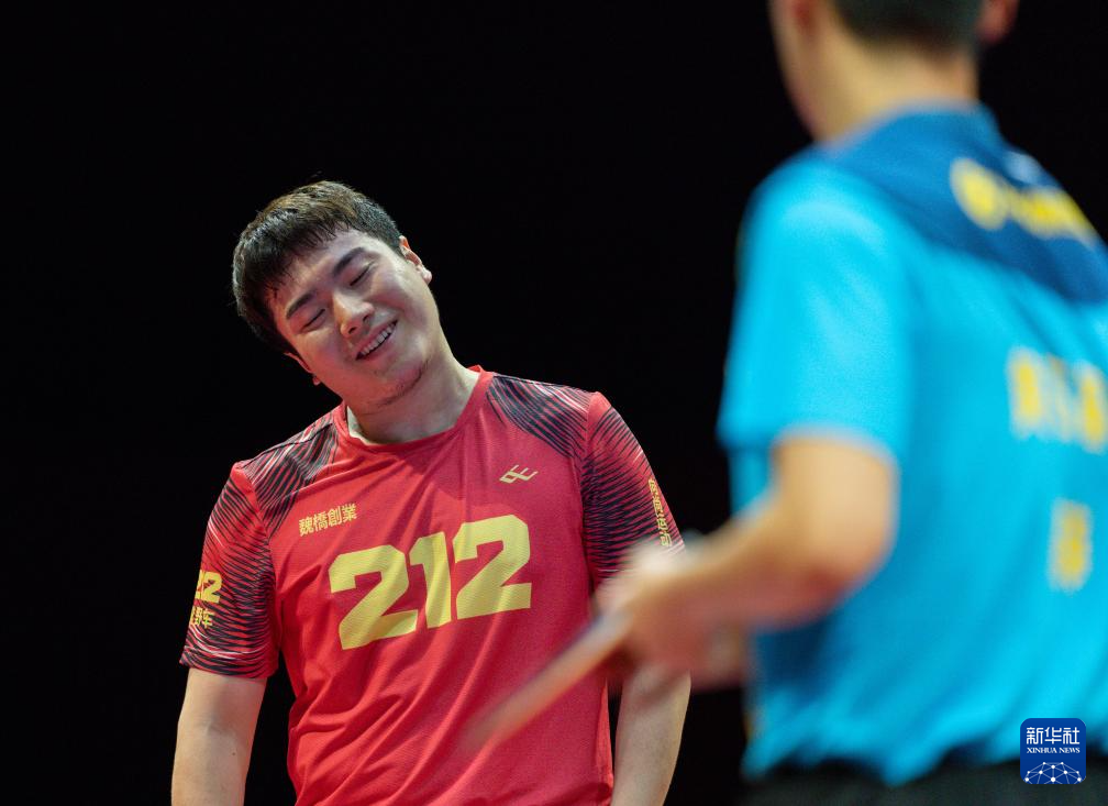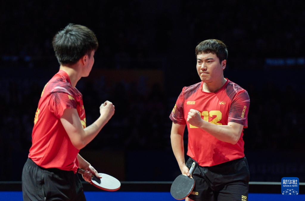 1月1日,山东魏桥·向尚运动队组合林昀儒/梁靖崑(右)在双打比赛中庆祝得分。他们3比2战胜黄石基地·华新队组合向鹏/薛飞。