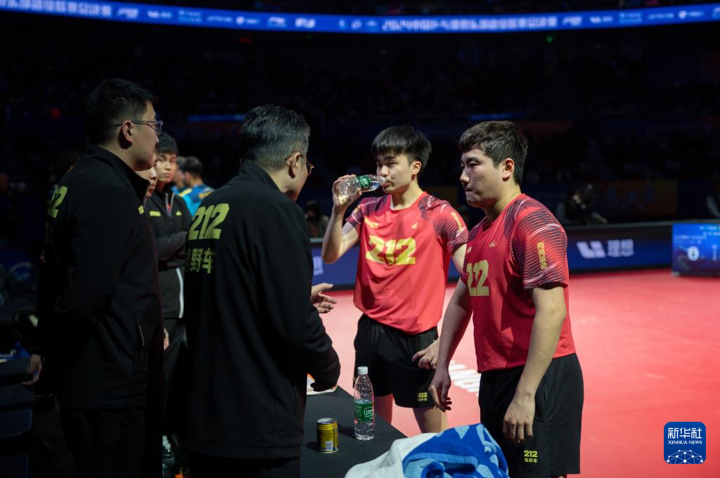 1月1日,黄石基地·华新队组合向鹏(左)/薛飞在双打比赛中商议战术。他们2比3不敌山东魏桥·向尚运动队组合林昀儒/梁靖崑。