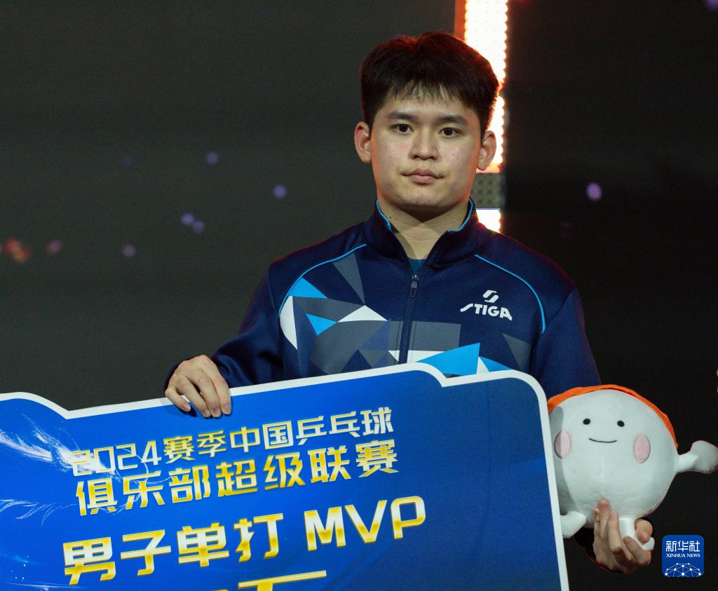 1月1日,获得男子单打MVP(最有价值球员)的黄石基地·华新队选手林诗栋在颁奖仪式上。