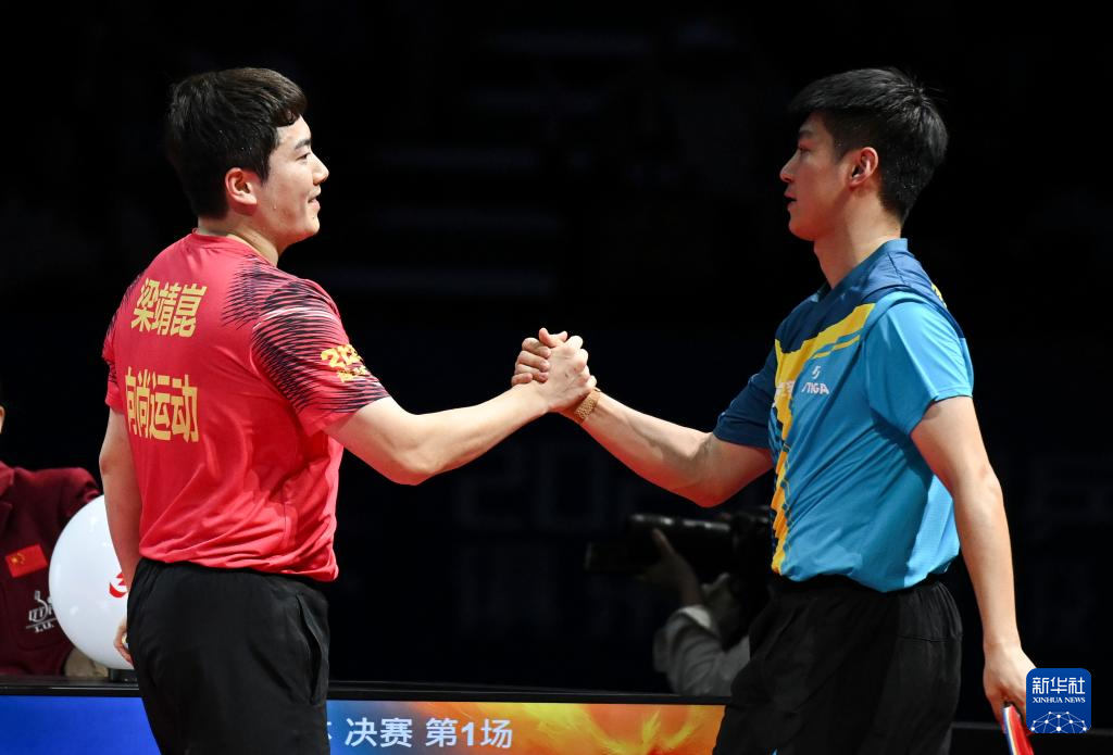1月1日,山东魏桥·向尚运动队选手梁靖崑(左)与黄石基地·华新队选手薛飞在单打比赛后握手。梁靖崑3比1战胜薛飞。
