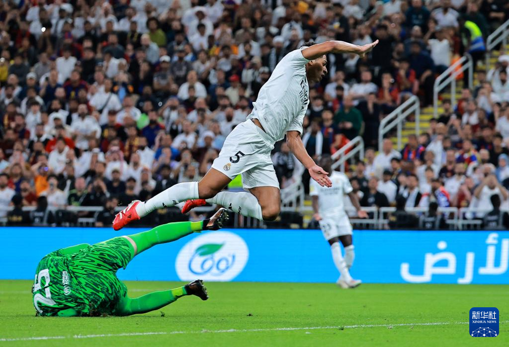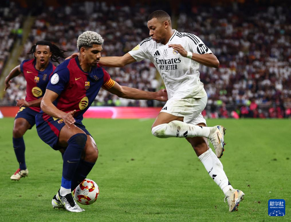 1月12日,皇家马德里队球员姆巴佩(右)与巴塞罗那队球员阿劳霍在比赛中拼抢。