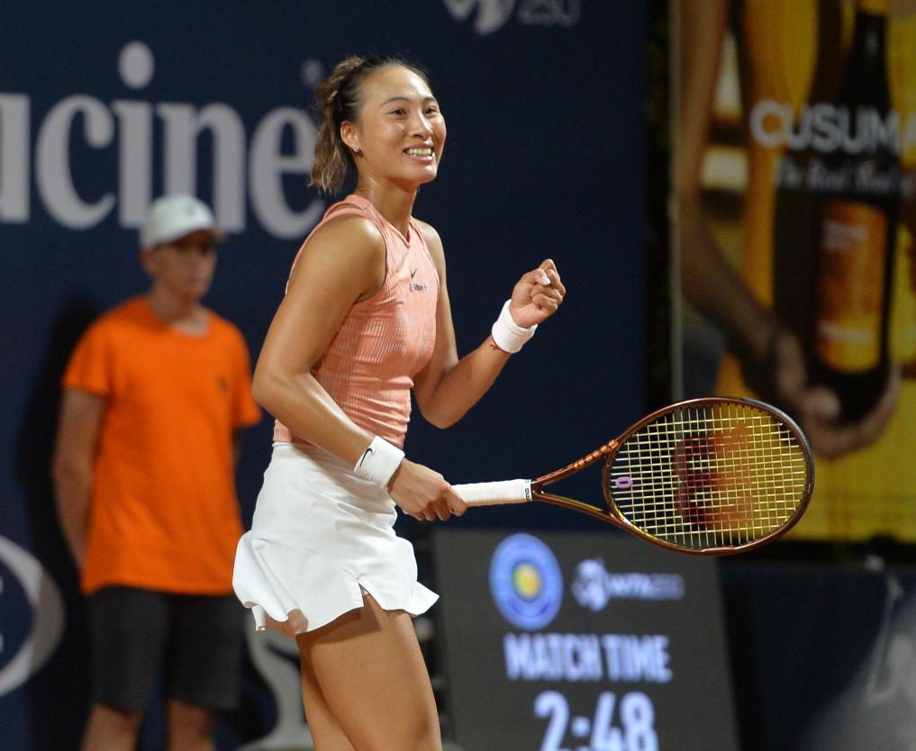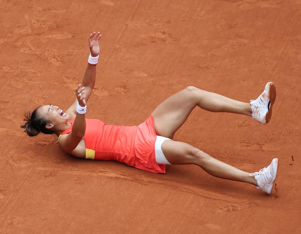 2024年7月21日,郑钦文庆祝比赛胜利。当日,在意大利巴勒莫举行的国际女子网球协会(WTA)250巴勒莫站单打决赛中,中国选手郑钦文2比1战胜捷克选手穆霍娃,夺得冠军。新华社发