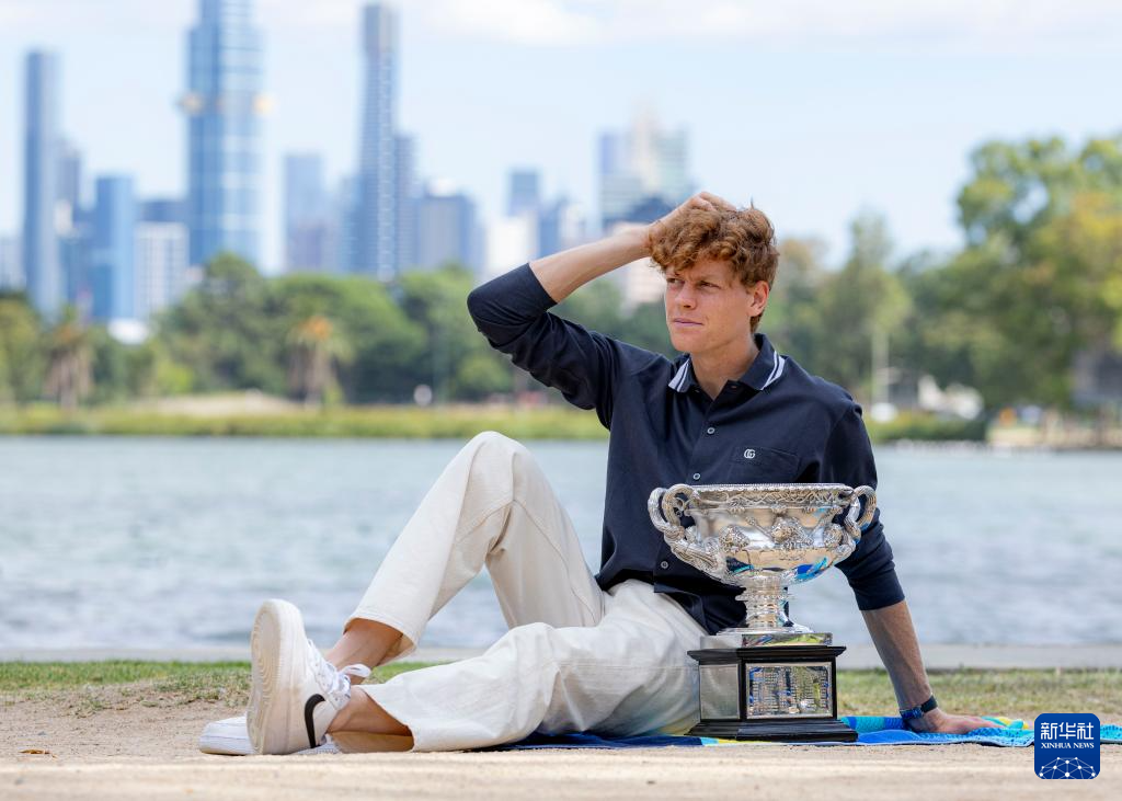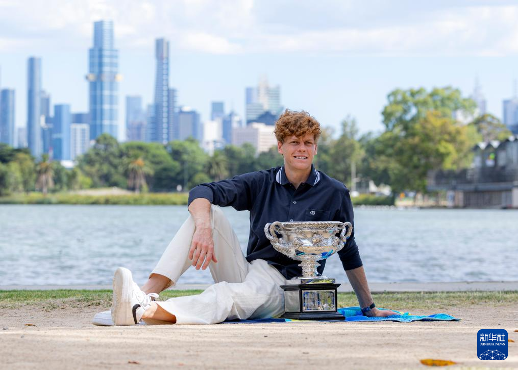 当日,2024年澳大利亚网球公开赛男子单打冠军、意大利选手辛纳在墨尔本阿尔伯特公园湖边展示冠军奖杯。