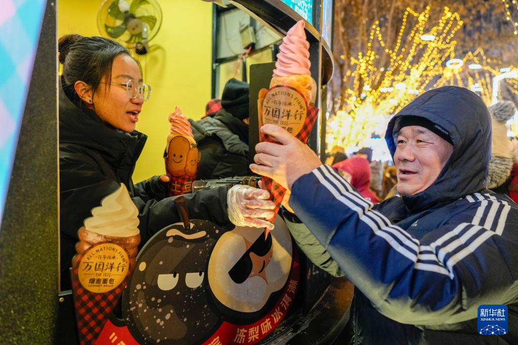 1月30日,游客在哈尔滨中央大街上购买“烟囱冰淇淋”。