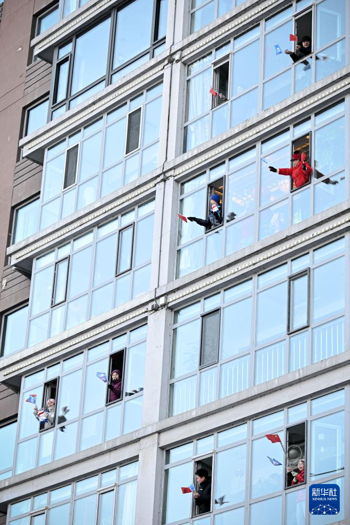 2月3日,观众在火炬传递沿途为火炬手加油。新华社记者 颜麟蕴 摄