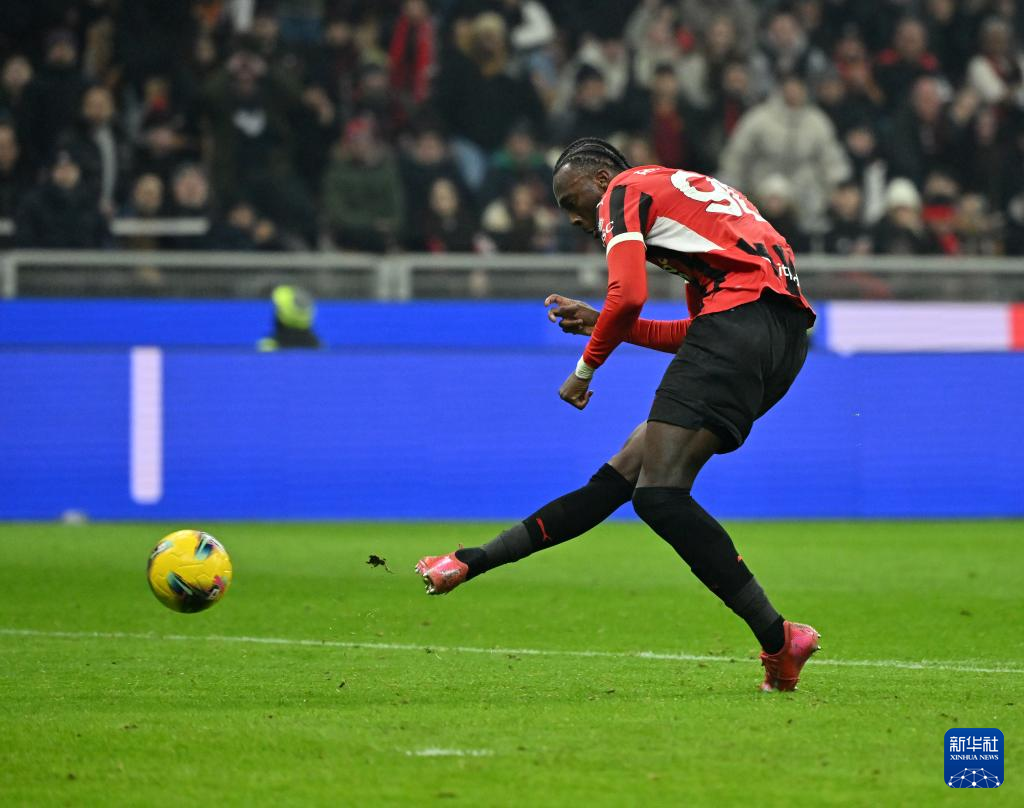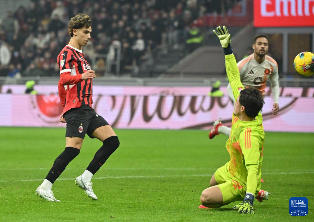 2月5日,AC米兰队球员菲利克斯(左)在比赛中射门得分。