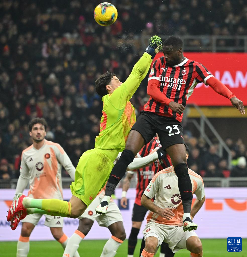 2月5日,AC米兰队球员托莫里(右)与罗马队门将斯维拉尔在比赛中拼抢。