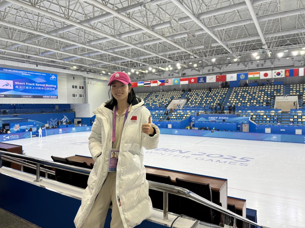 在北京冬奥会上和范可新一起为中国队夺得混合接力金牌的曲春雨是亚冬会的开幕式执旗手之一,她8日在短道速滑赛场为队友们助威。