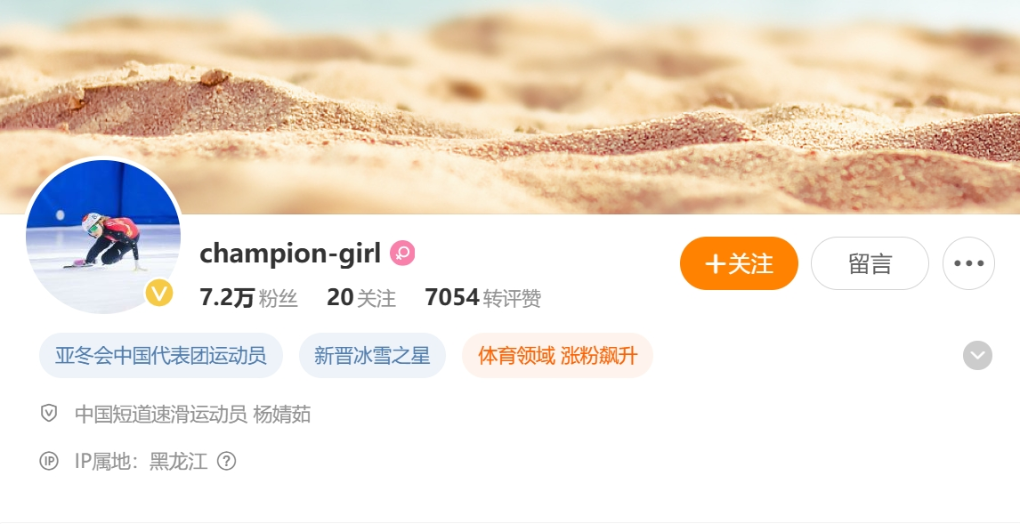 来参加亚冬会,杨婧茹的目标就是学习。“积累经验,学习,希望自己以后比赛表现更好!”她说,她的微博名称是champion-girl(冠军女孩),“这是为了激励自己!”