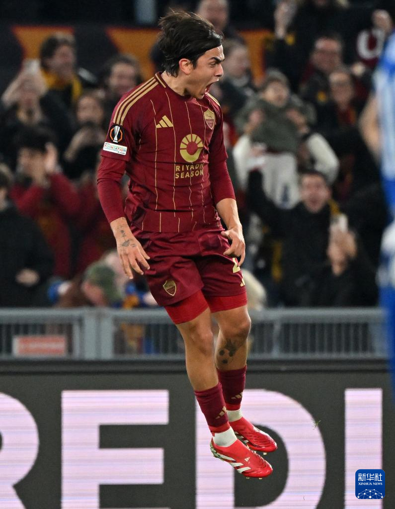2月20日,罗马队球员迪巴拉(上)和队友庆祝进球。