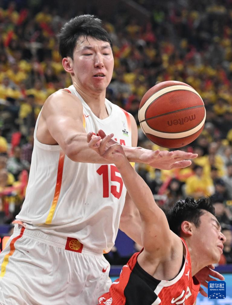 2月20日,中国队球员周琦(右)在比赛中防守。
