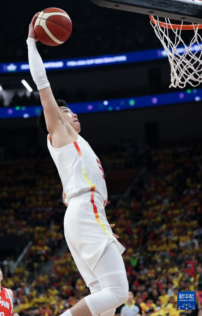 2月20日,中国队球员朱俊龙在比赛中扣篮。