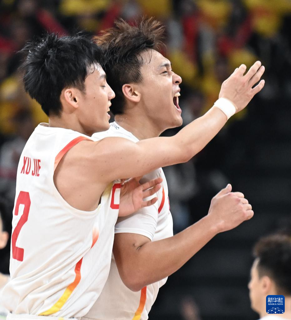 2月20日,中国队球员徐杰(右)和赵睿(中)在比赛中庆祝。