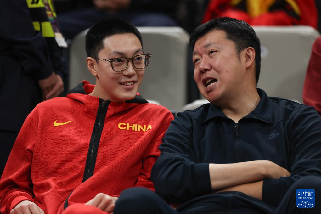 2月20日,中国队球员胡明轩(左)和前中国国家队球员王治郅在场边交流。