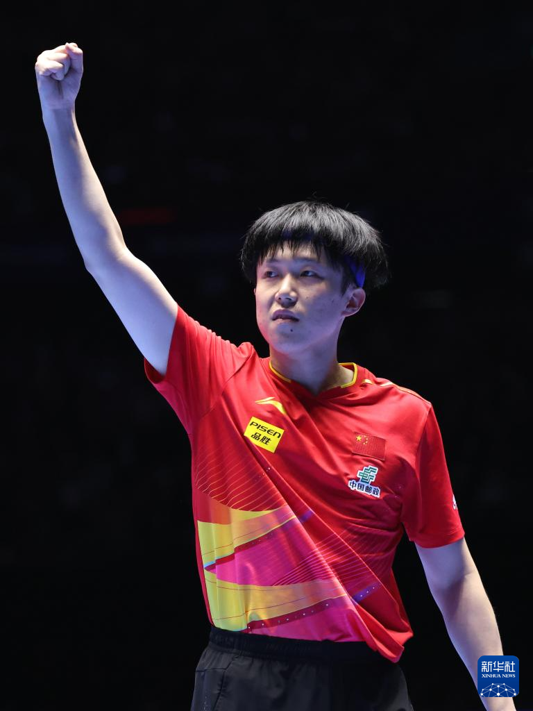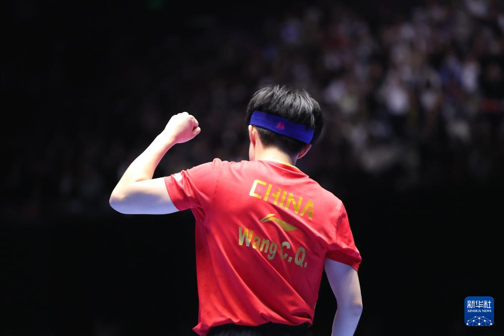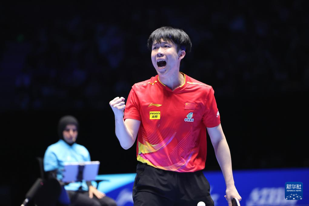 2月23日,王楚钦在比赛中庆祝得分。