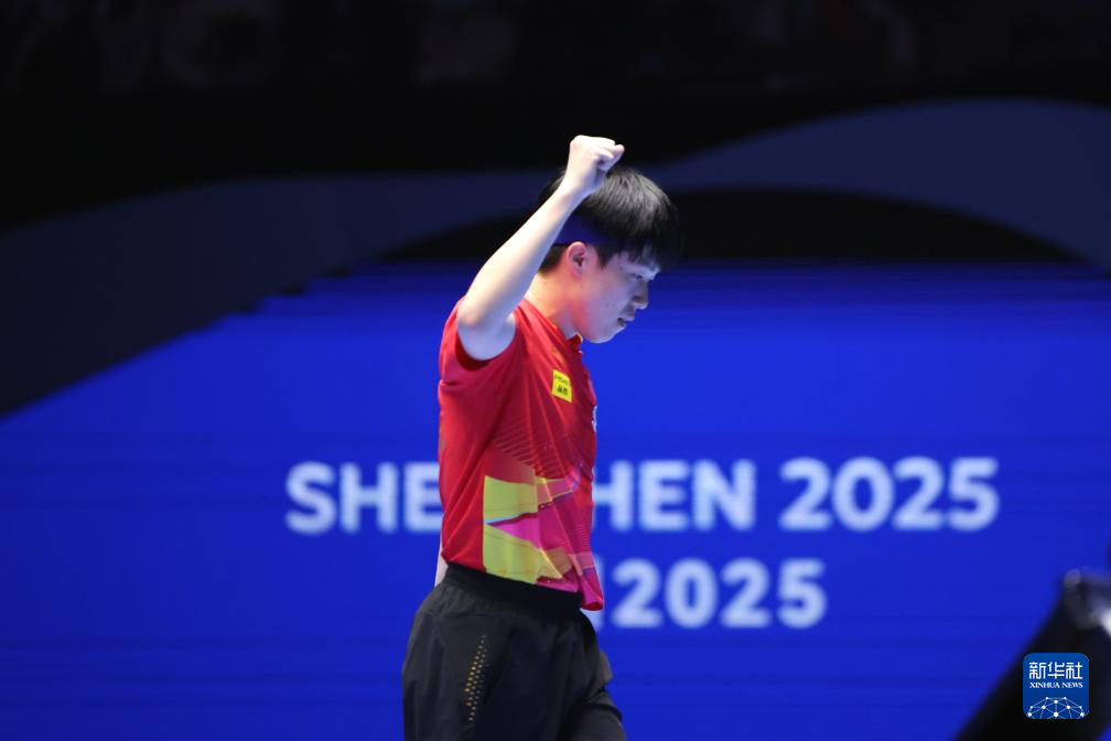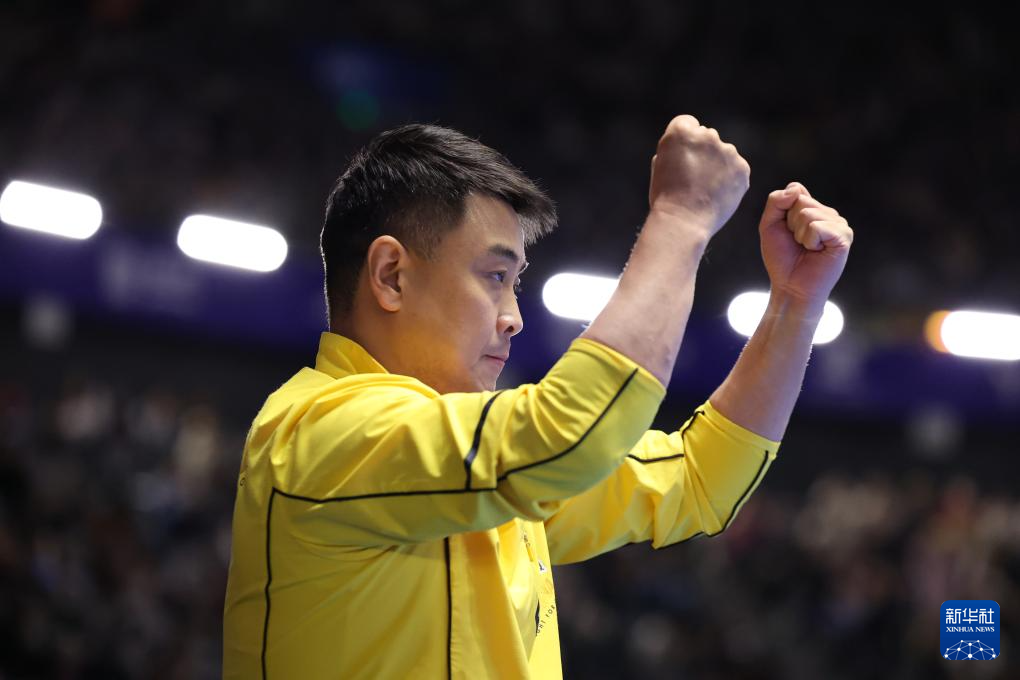 2月23日,王楚钦获胜后,王皓教练在场边握拳庆祝。