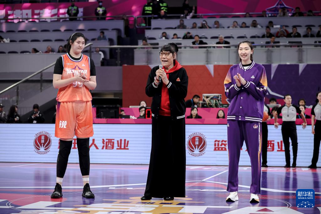 2月22日,北区星锐队特邀球员张子宇(左)、中国篮球名人堂成员郑海霞(中)、WCBA全明星正赛球员韩旭在比赛间隙参加活动。
