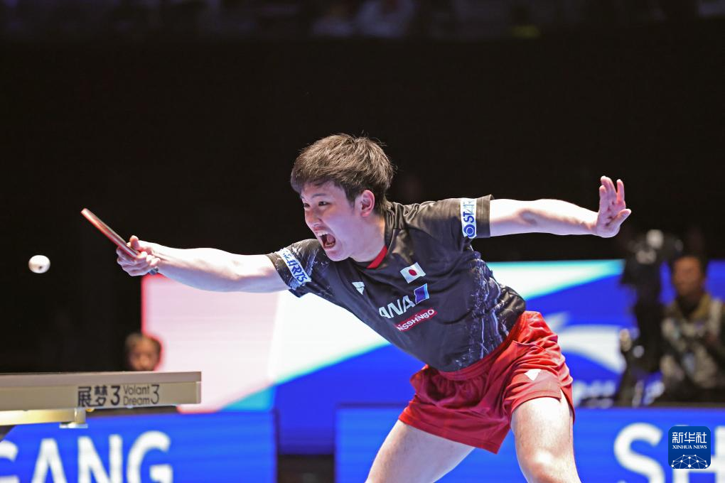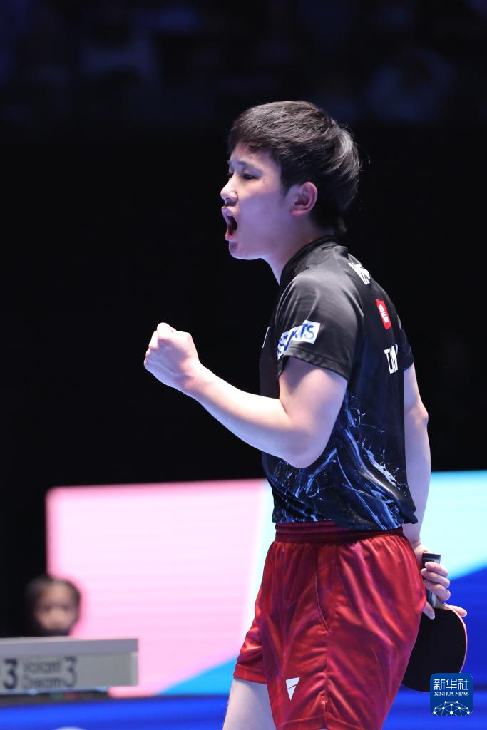 2月22日,张本智和在比赛中庆祝得分。