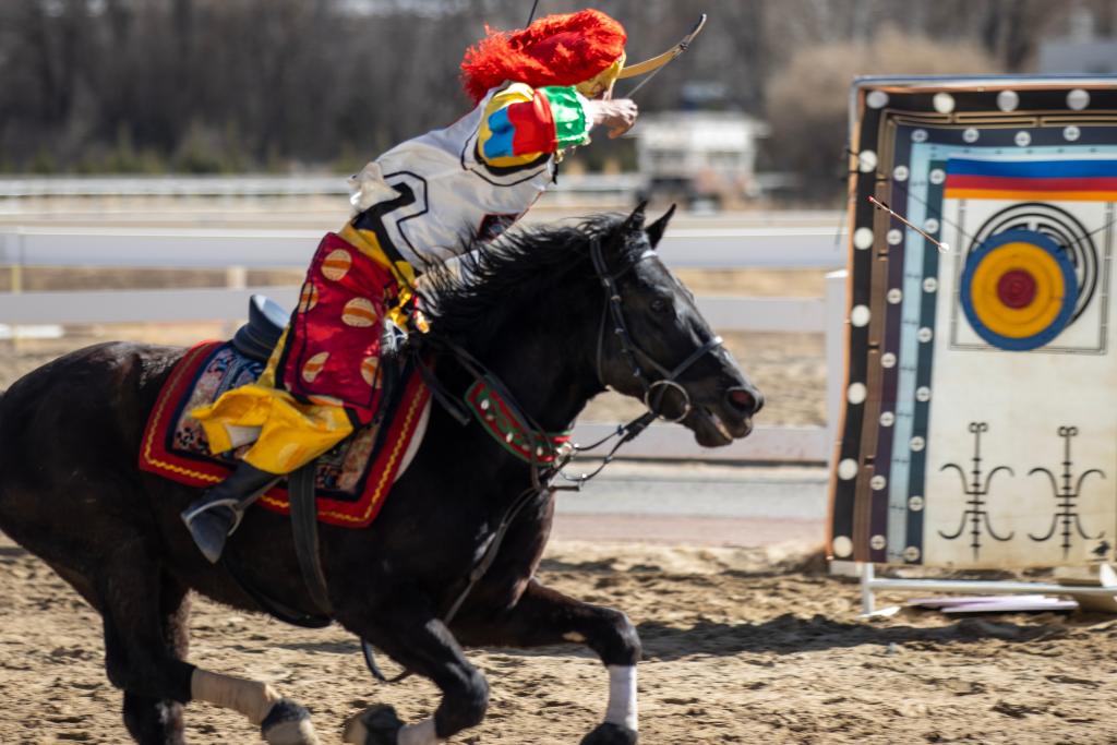 ↑马术队员在表演“马上民族传统响箭五连靶”项目