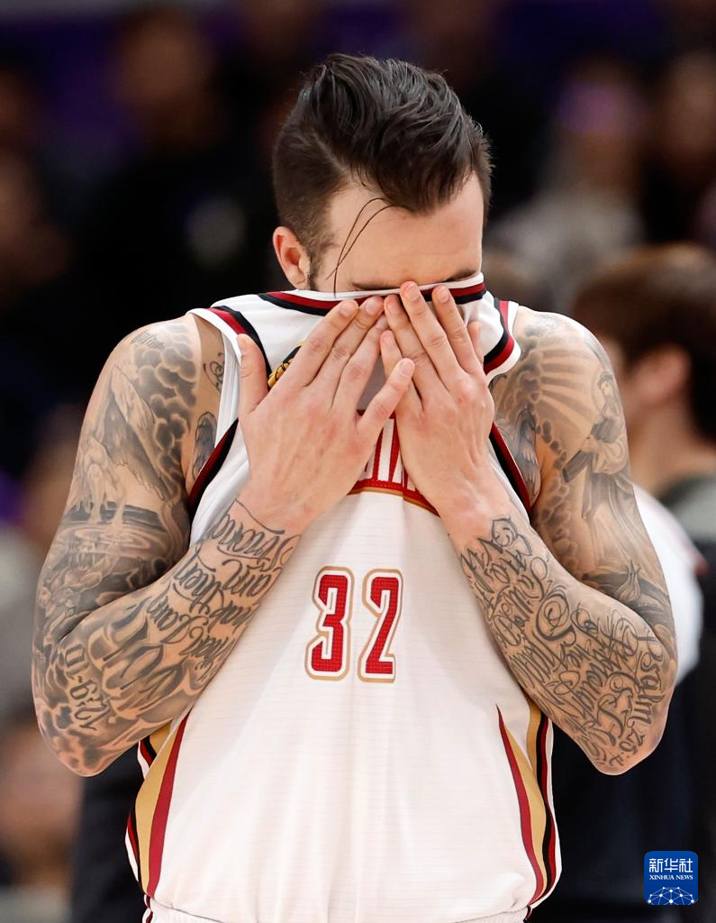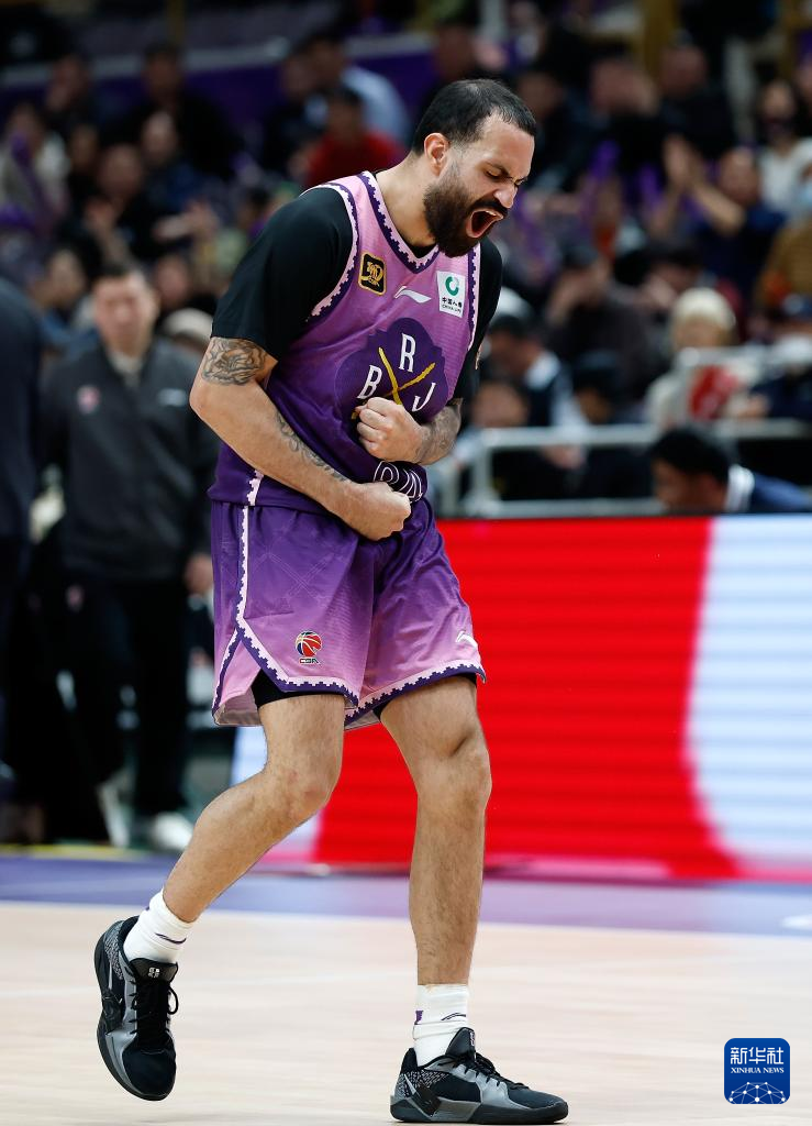 3月6日,北京控股队球员格兰特·里勒在比赛中庆祝得分。