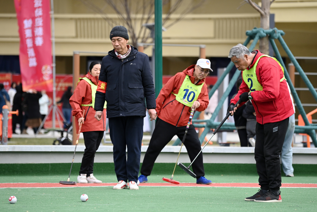 1月15日,“西安年·最中国”2025年全国全民健身大拜年(西安市分会场)系列活动在西安市人民体育场启动。图为市民在改造后的西安市人民体育场进行门球比赛。新华社记者 李一博 摄