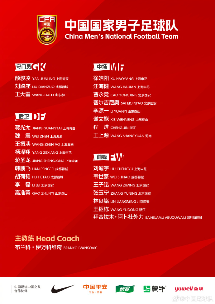 中国队公布的大名单中,除了有伤在身的朱辰杰、武磊外,王大雷、张玉宁、韦世豪、蒋光太等主力球员悉数在列。参加了集训的韩佳奇、侯永永、吴少聪、汪士钦、刘浩帆、徐彬、黄政宇落选。
