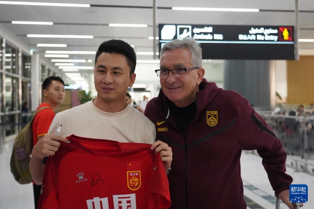 3月17日,中国队主教练伊万科维奇(右)在利雅得哈立德国王机场与球迷合影。