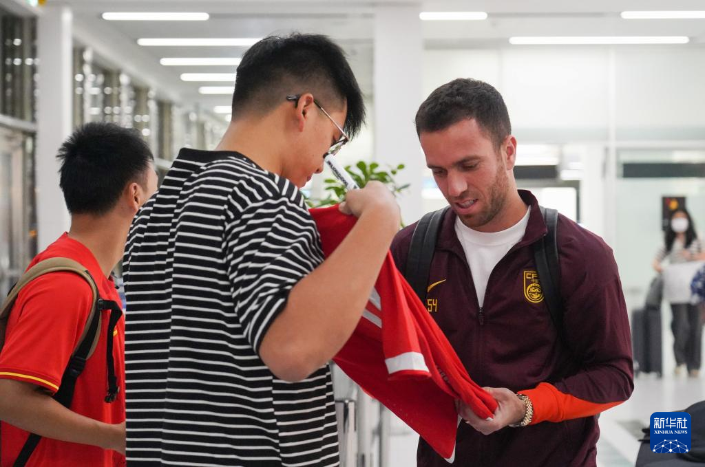 3月17日,中国队球员塞尔吉尼奥(右)在利雅得哈立德国王机场为球迷签名。
