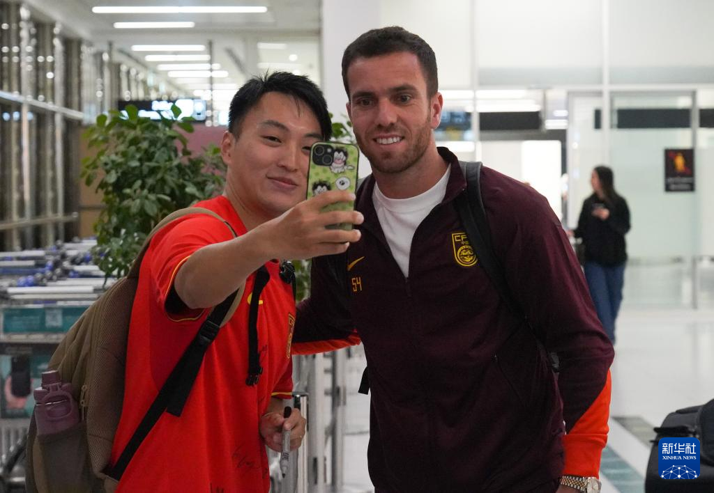 3月17日,中国队球员塞尔吉尼奥(右)在利雅得哈立德国王机场与球迷合影。