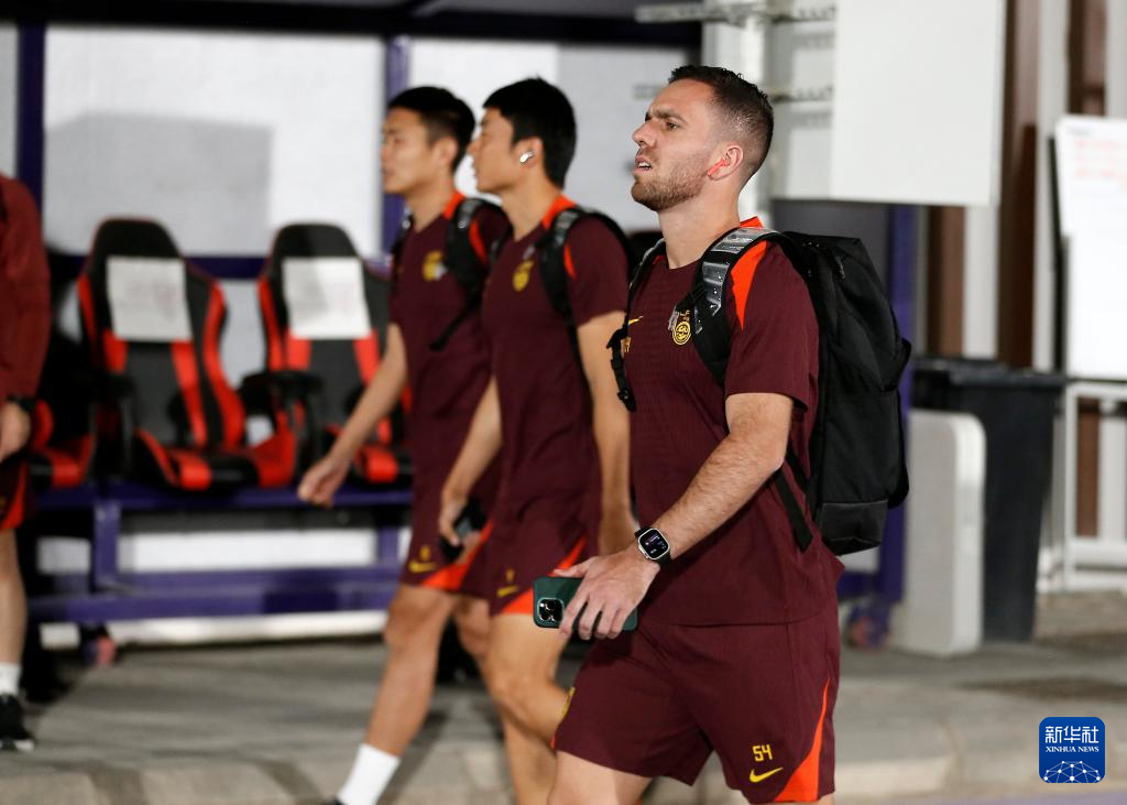 3月18日,中国队球员塞尔吉尼奥(右)抵达训练场地。