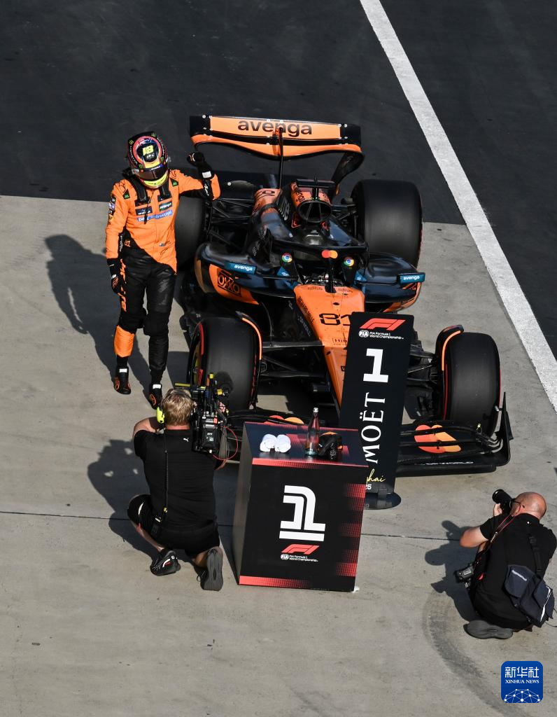 3月22日,迈凯伦车队澳大利亚车手皮亚斯特里在赛后庆祝夺得杆位。