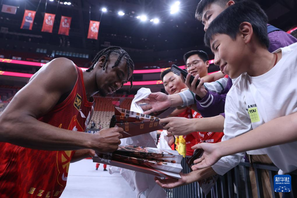 3月23日,深圳马可波罗队球员马凯尔·约翰逊(左)在赛后为球迷签名。