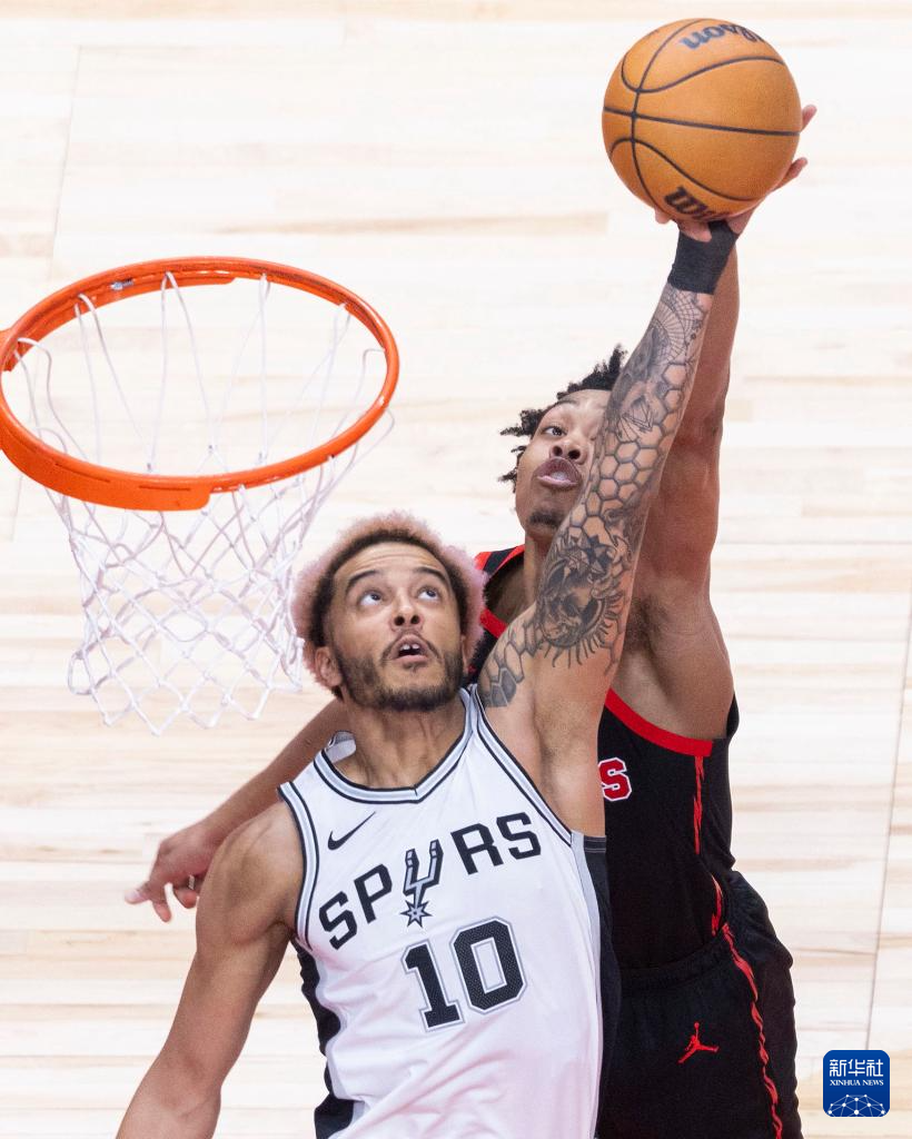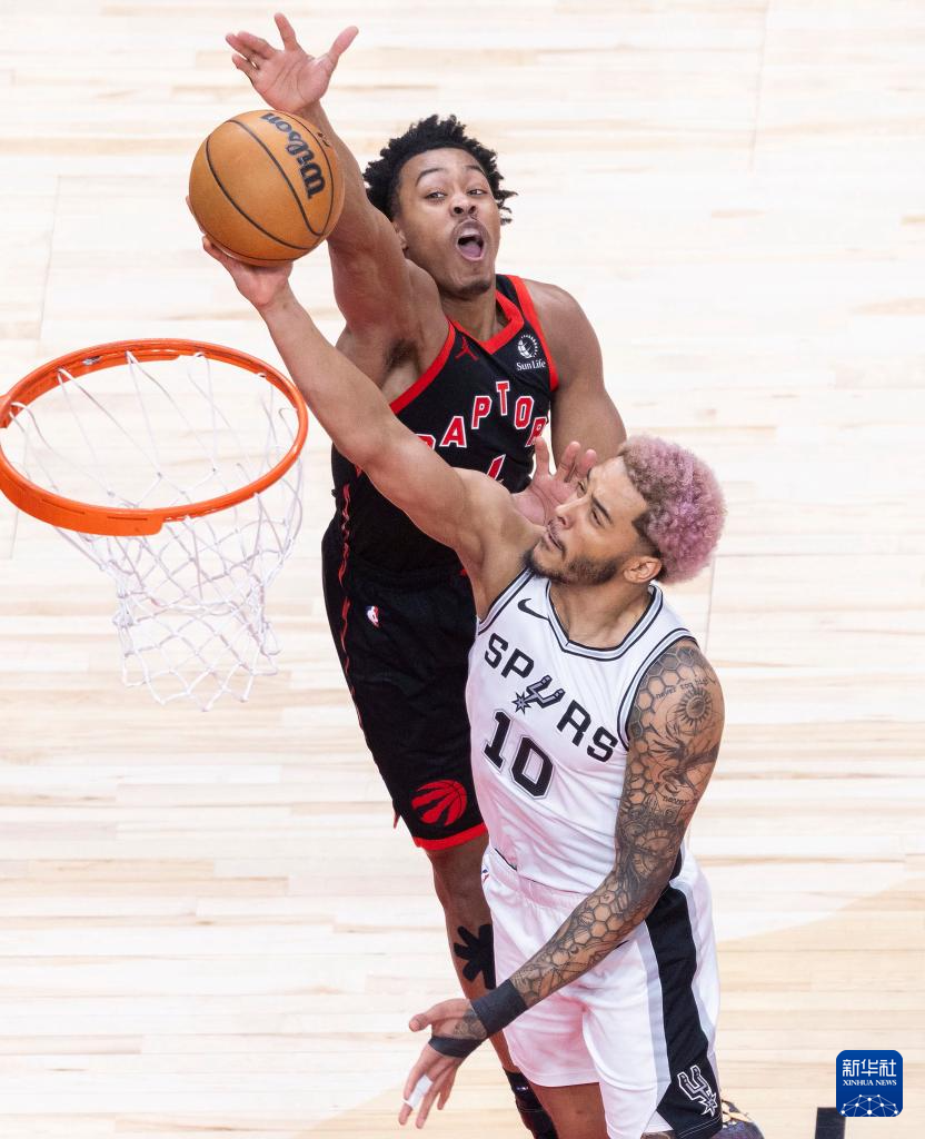 3月23日,猛龙队球员巴恩斯(右)与马刺队球员马穆克拉什维利在比赛中拼抢。