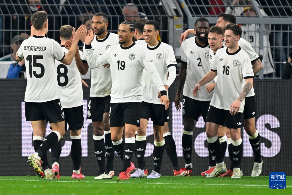 3月23日,德国队球员穆夏拉(右五)进球后与队友庆祝。