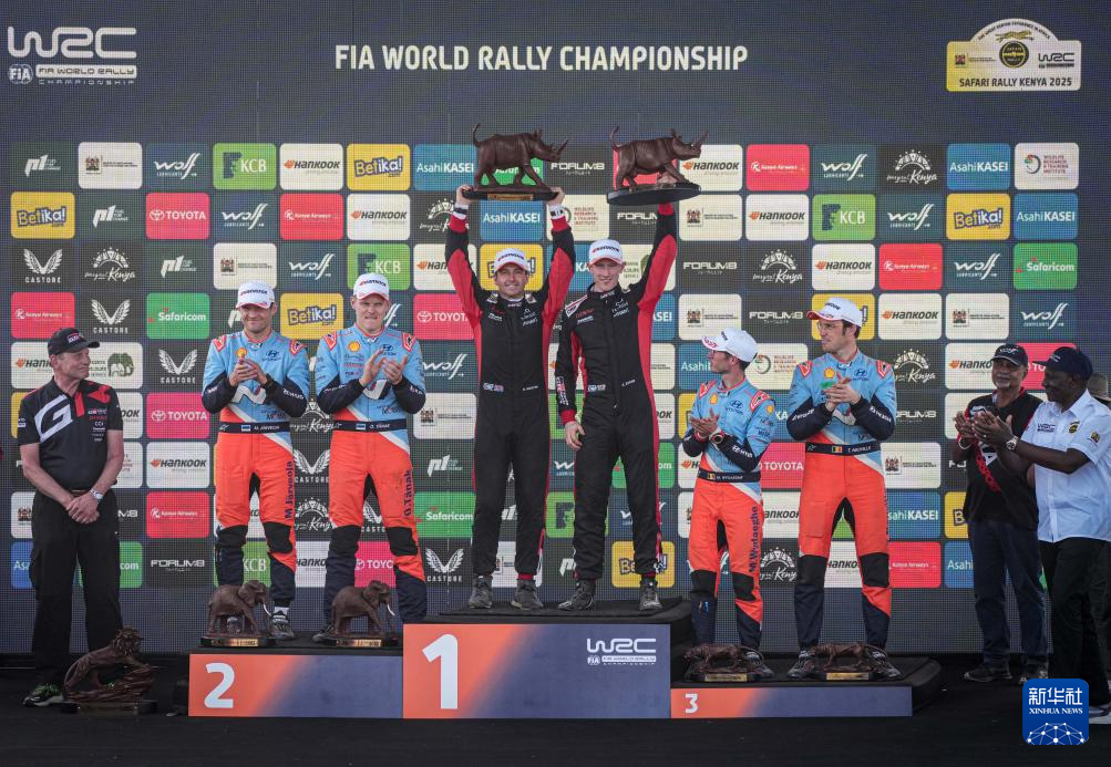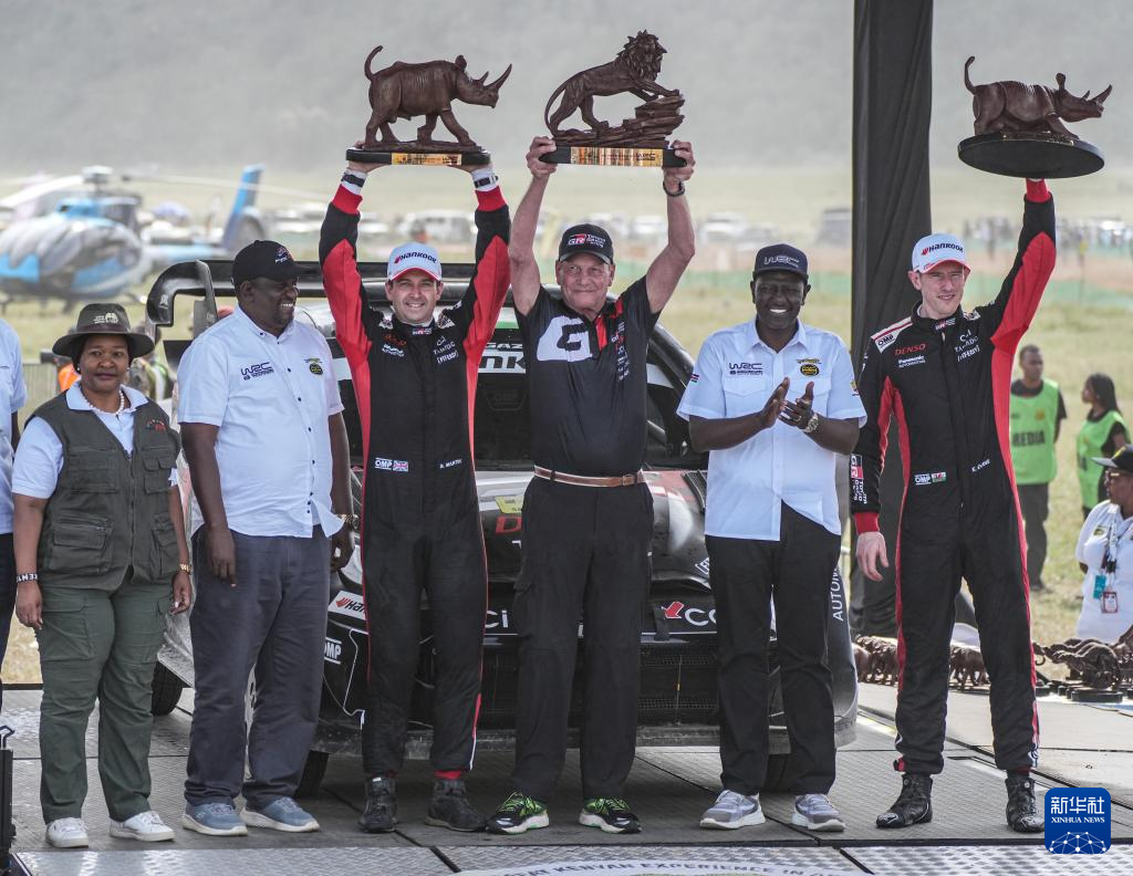 3月23日,在肯尼亚奈瓦沙举办的第73届肯尼亚萨法里拉力赛上,冠军丰田车队英国车手埃尔芬·埃文斯(上右)与领航员斯科特·马丁(上左)在颁奖仪式上庆祝。
