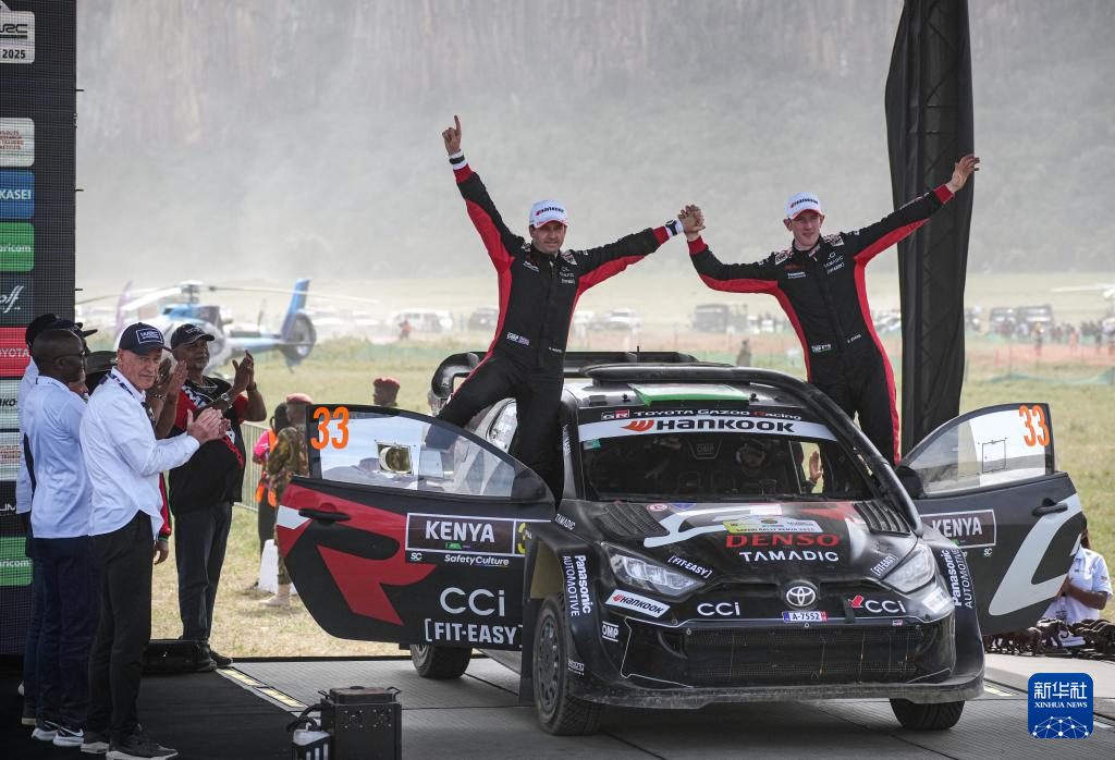 3月23日,在肯尼亚奈瓦沙举办的第73届肯尼亚萨法里拉力赛上,丰田车队英国车手埃尔芬·埃文斯(上右)与领航员斯科特·马丁(上左)庆祝胜利。