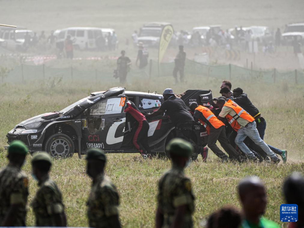 3月23日,在肯尼亚奈瓦沙举办的第73届肯尼亚萨法里拉力赛上,工作人员和参赛选手将一辆临近终点失去动力的赛车推至车辆停放处。