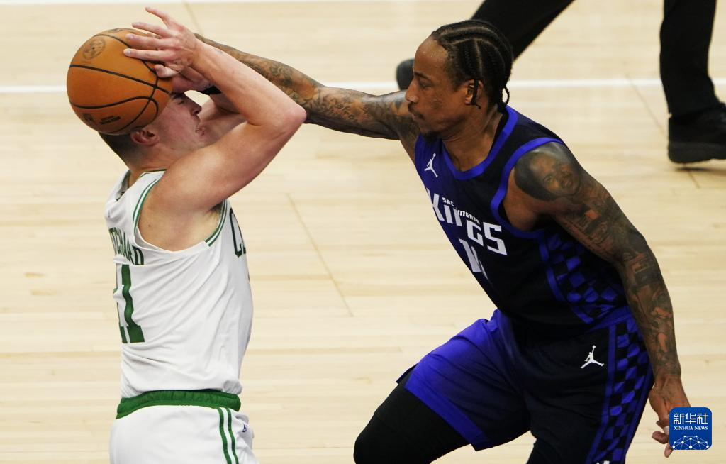 3月24日,国王队球员德马尔·德罗赞(右)在比赛中防守。