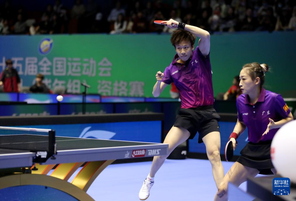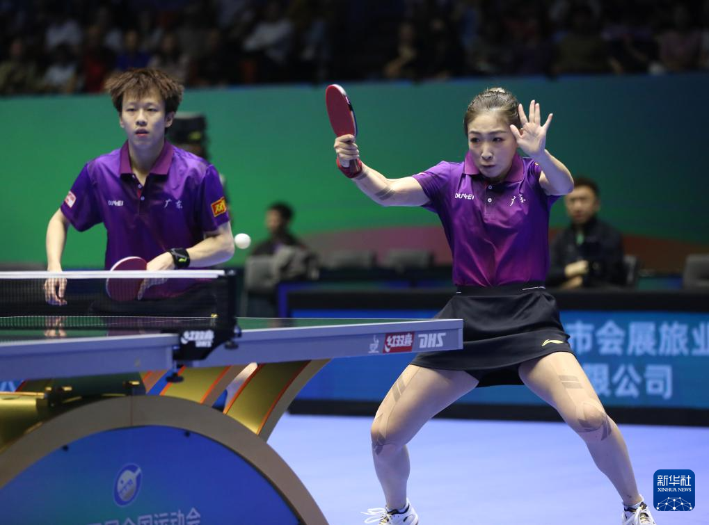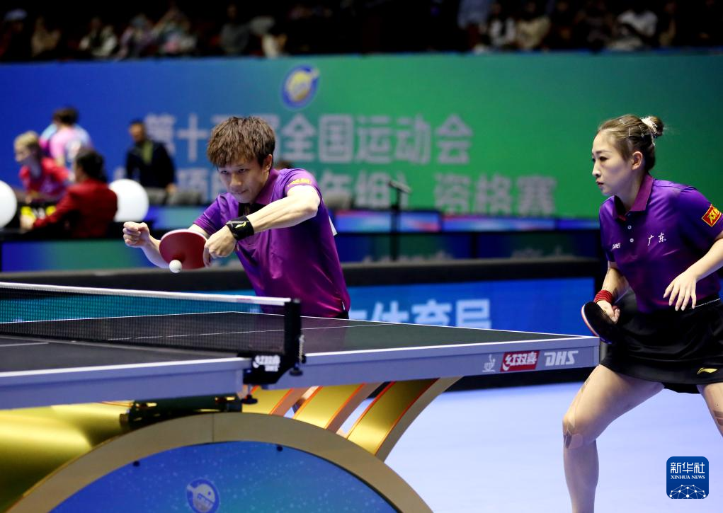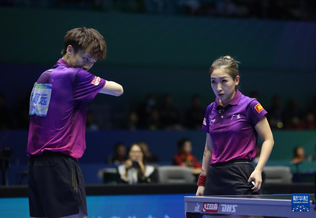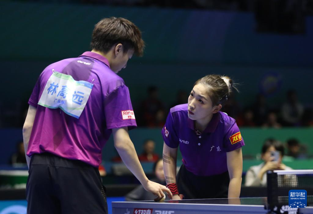 3月24日,广东队组合林高远(左)/刘诗雯在比赛中回球。他们3比0战胜辽宁队组合王浩丞/闫禹橦。