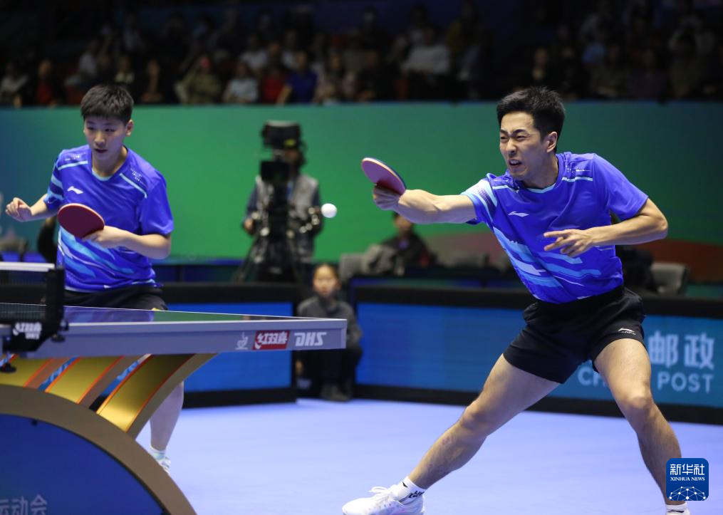 3月24日,辽宁队组合王浩丞/闫禹橦(左)在比赛中回球。他们0比3不敌广东队组合林高远/刘诗雯。