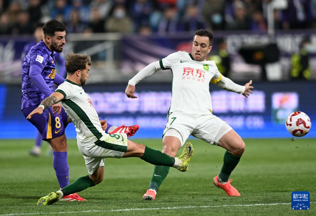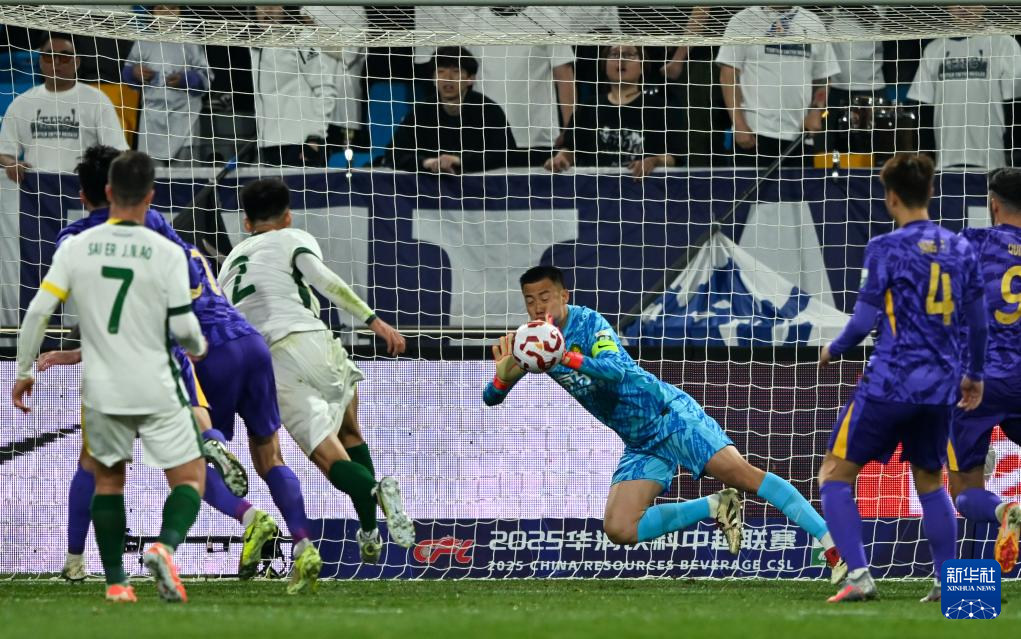 4月2日,北京国安队守门员韩佳奇(中)在比赛中扑救。