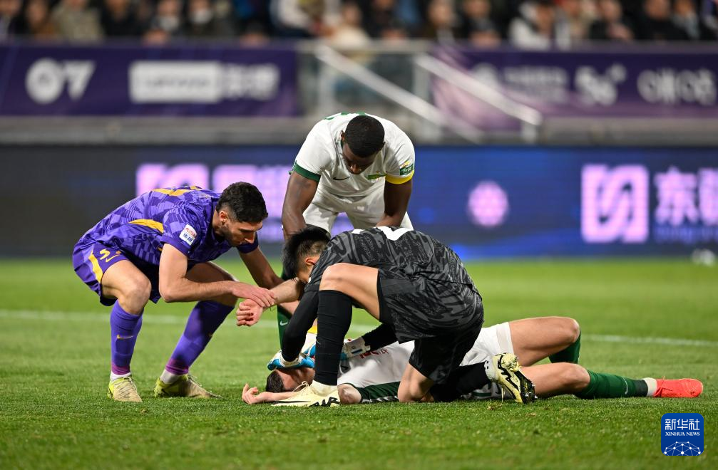 4月2日,天津津门虎队守门员在方镜淇(前)在比赛中为失去意识的北京国安队球员斯帕吉奇(下)急救。