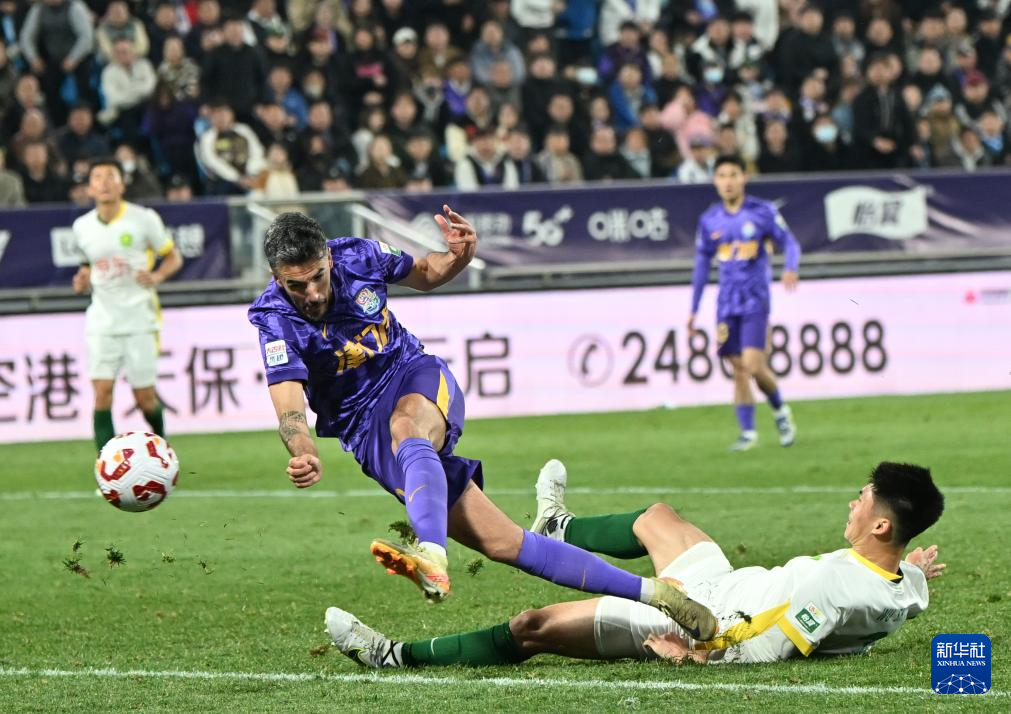 4月2日,天津津门虎队球员哈达斯(左)在比赛中射门。
