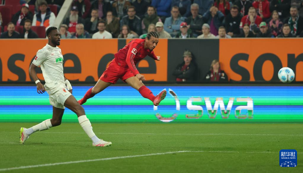 4月4日,拜仁慕尼黑队球员萨内(右)在比赛中射门。
