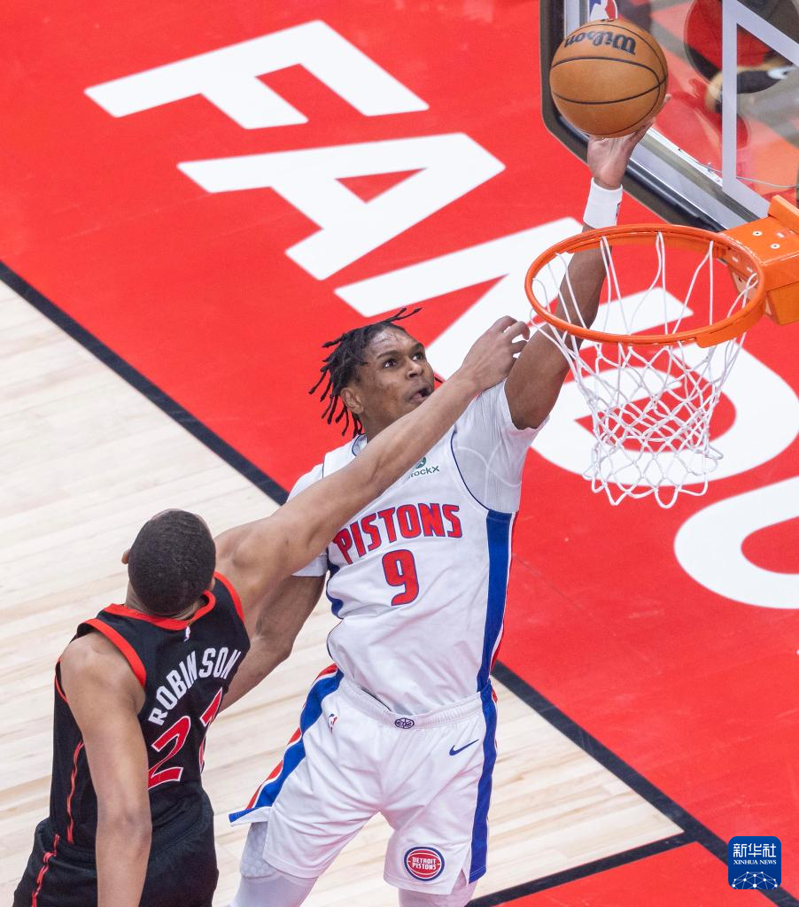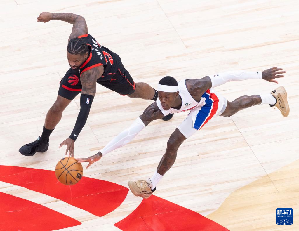4月4日,猛龙队球员罗宾逊(左)与活塞队球员冯泰奇奥在比赛中争抢篮板球。