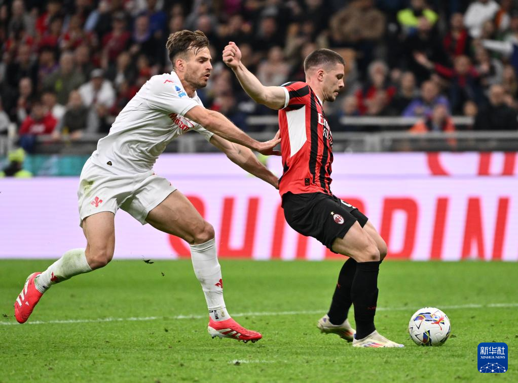 4月5日,AC米兰队球员约维奇(右)在比赛中射门得分。