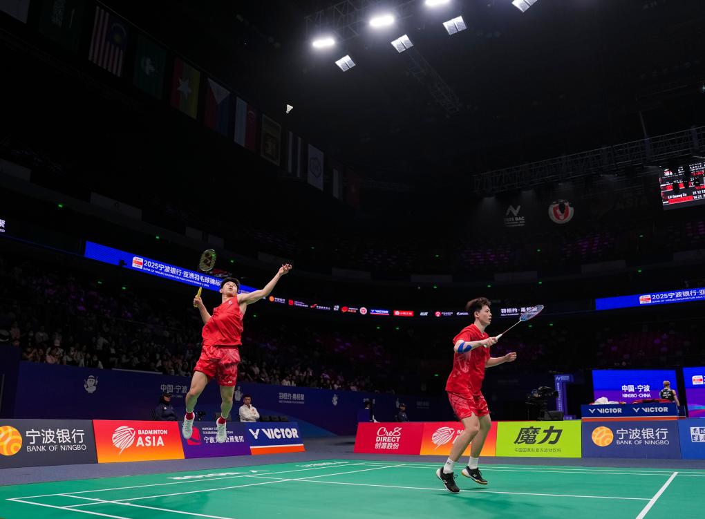 4月9日,陈柏阳/刘毅(左)在比赛中。当日,在浙江宁波举行的2025亚洲羽毛球锦标赛男子双打首轮比赛中,中国组合陈柏阳/刘毅2:1战胜印度尼西亚组合咖塔曼/伊斯法哈尼,晋级16强。新华社记者 孙非 摄