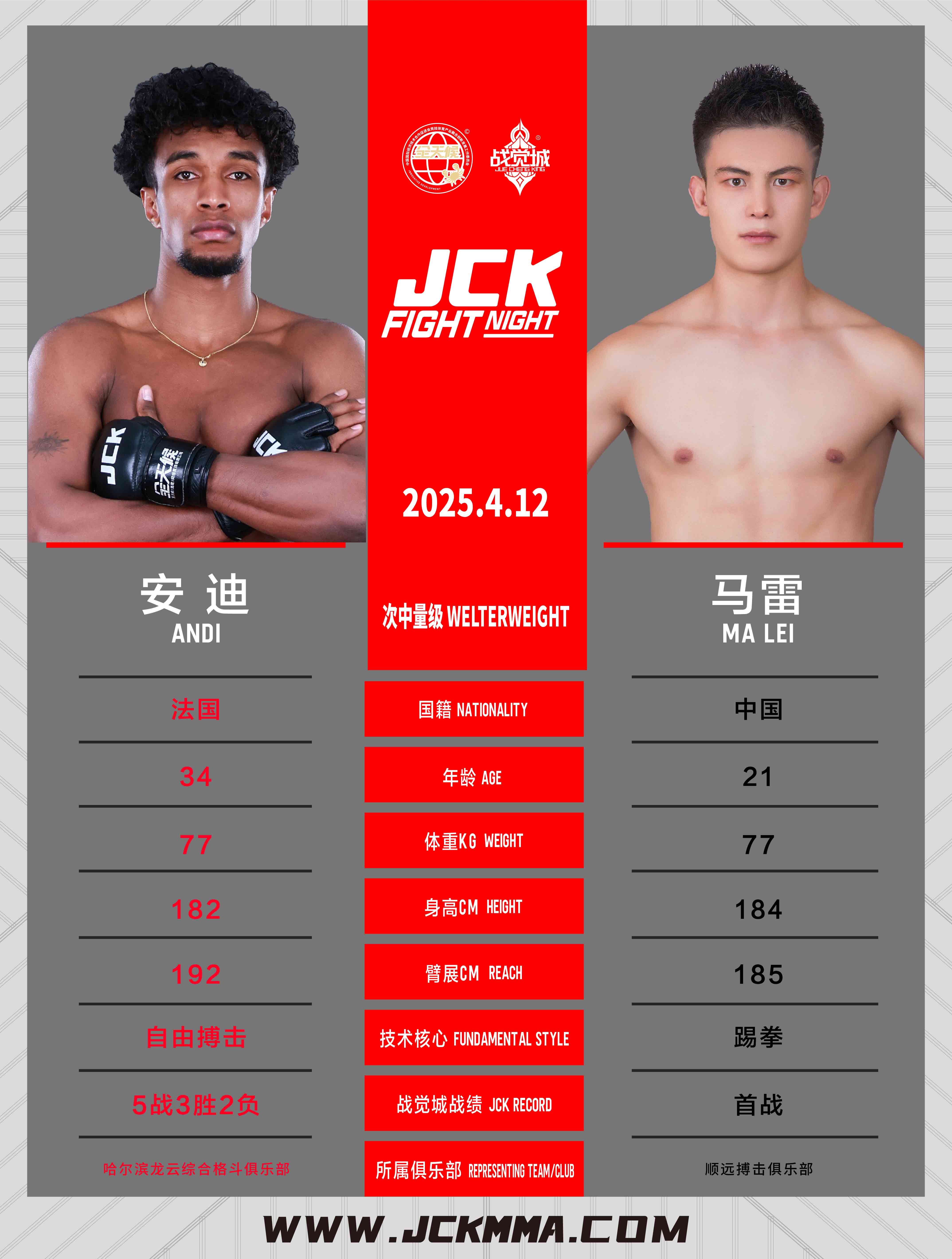 马雷,年龄21岁,技术核心:踢拳,本场是他综合格斗职业生涯的首秀,亦是JCK战觉城首战。