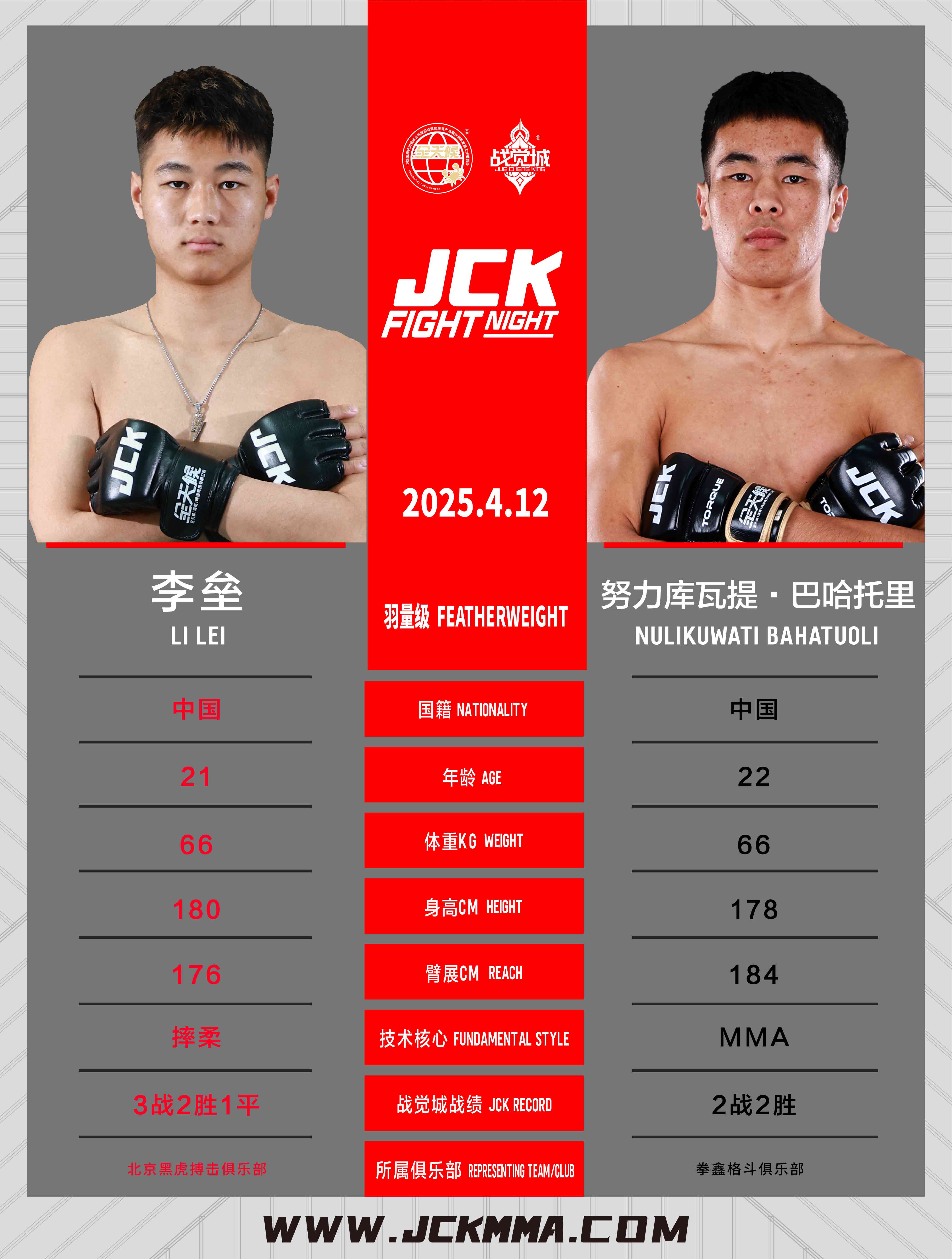 李垒,年龄21岁,技术核心:摔柔,在JCK战觉城3战2胜1平,曾一致判定战胜艾力帕提·帕力塔洪、首回合背后裸绞降服扎恩哈尔·奴尔木哈买提,与印度冠军选手雷汉·卢拉三回合战平。