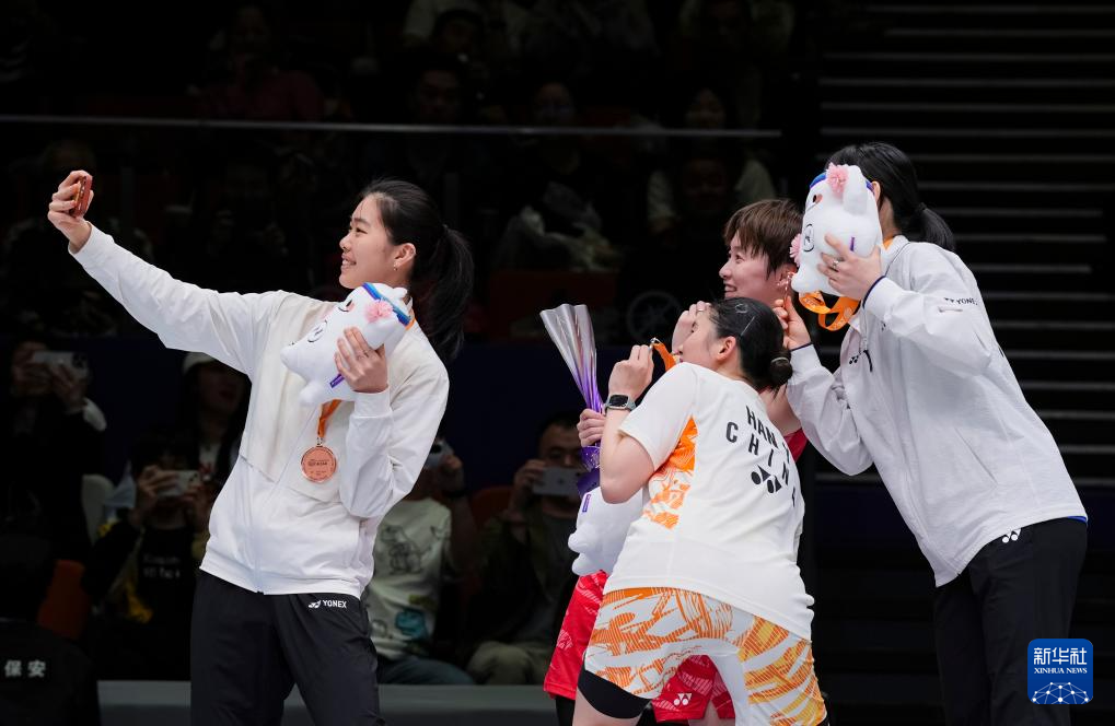 4月13日,冠军陈雨菲(左三)在颁奖仪式上庆祝。